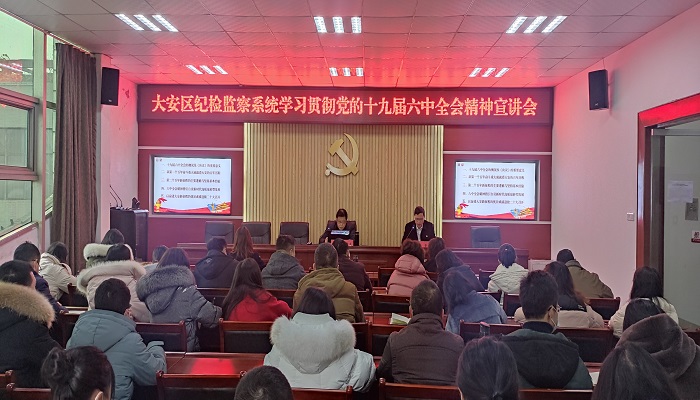 1月7日下午,大安区纪委监委邀请大安区人大常委会原主任、《大安》杂志主编裴建成作学习贯彻党的十九届六中全会精神宣讲报告。大安区委常委、区纪委书记、区监委主任董如荣出席并讲话。
