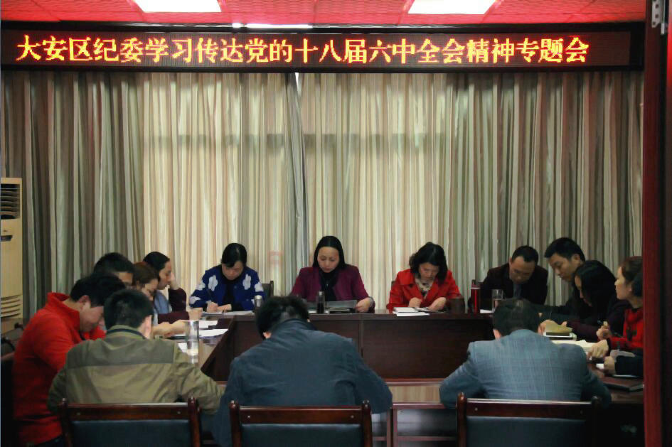 11月4日,大安区纪委将学习宣传贯彻党的十八届六中全会精神作为重要政治任务,采取多项措施,迅速掀起学习贯彻热潮。一是认真学习公报原文。区纪委第一时间召纪委常委扩大会议,就《中国共产党第十八届中央委员会第六次全体会议公报》进行传达学习,将全会精神原原本本地领会。二是结合专家解读细致学。抓住关键词,明确中心和重点,从而深化对全会精神内涵的认识。三是开展讨论深入学。结合现实问题、结合本职工作,组织热烈讨论,党员干部就如何贯彻落实全会精神进行发言,相互交流学习心得。四是转化实践学。将六中全会精神学习宣传与“两学一做”学习教育紧密结合起来,牢固树立“四个意识”,严守纪律规矩,将六中全会精神学深悟透,切实做到知行合一,促进工作。