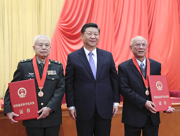 1月8日,2018年度国家科学技术奖励大会在北京人民大会堂隆重举行。中共中央总书记、国家主席、中央军委主席习近平向获得2018年度国家最高科学技术奖的哈尔滨工业大学刘永坦院士(右)和中国人民解放军陆军工程大学钱七虎院士(左)颁奖。(新华社记者 谢环驰 摄)